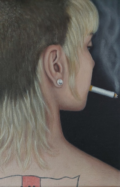 Skinhead has always been a highly visual culture, and photographs of skins from every period are plentiful – yet it has rarely been the subject of painting. Khana Evans, an English painter in her twenties, has begun to fill that gap with a growing body of portraits centred on subcultures, especially skinheads. Her figures, often female, are frequently shown from behind, or turned away from the viewer. What struck me immediately about Khana’s work, but also about her social media posts and her face in photographs, was a sense of sincerity. While it isn’t easily defined, it’s a quality you can sense at once. Her replies to my interview questions only reinforced this impression.