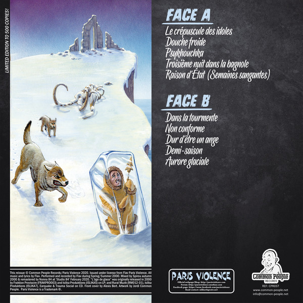 Paris Violence has never exactly played standard-issue Oi, but 20 years ago, Flav took things to the next level when releasing L’âge de glace – an album informed by his earlier ‘Chaos en France on a rainy Monday’ sound, but also by the eminently continental ‘cold wave’ genre and NWOBEM (New Wave of British ‘Eavy Metal). The result was arguably one of the coldest and strangest albums linked to the Oi genre, fully living up to its title: ice age.
