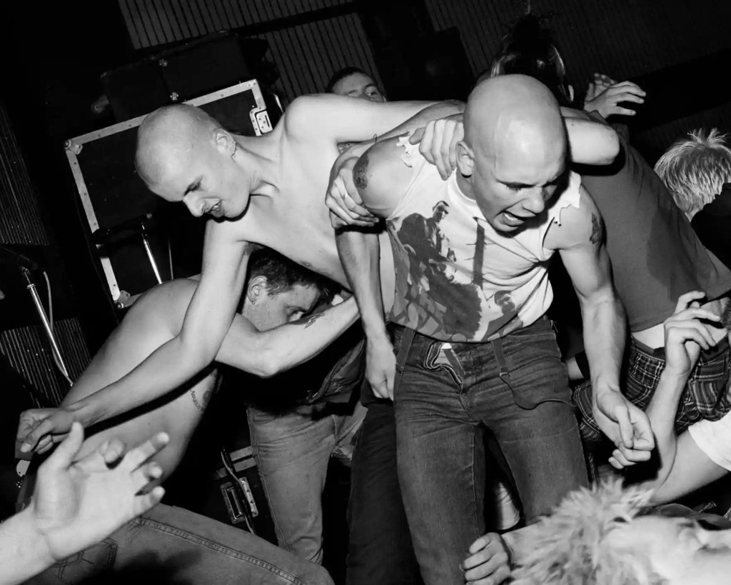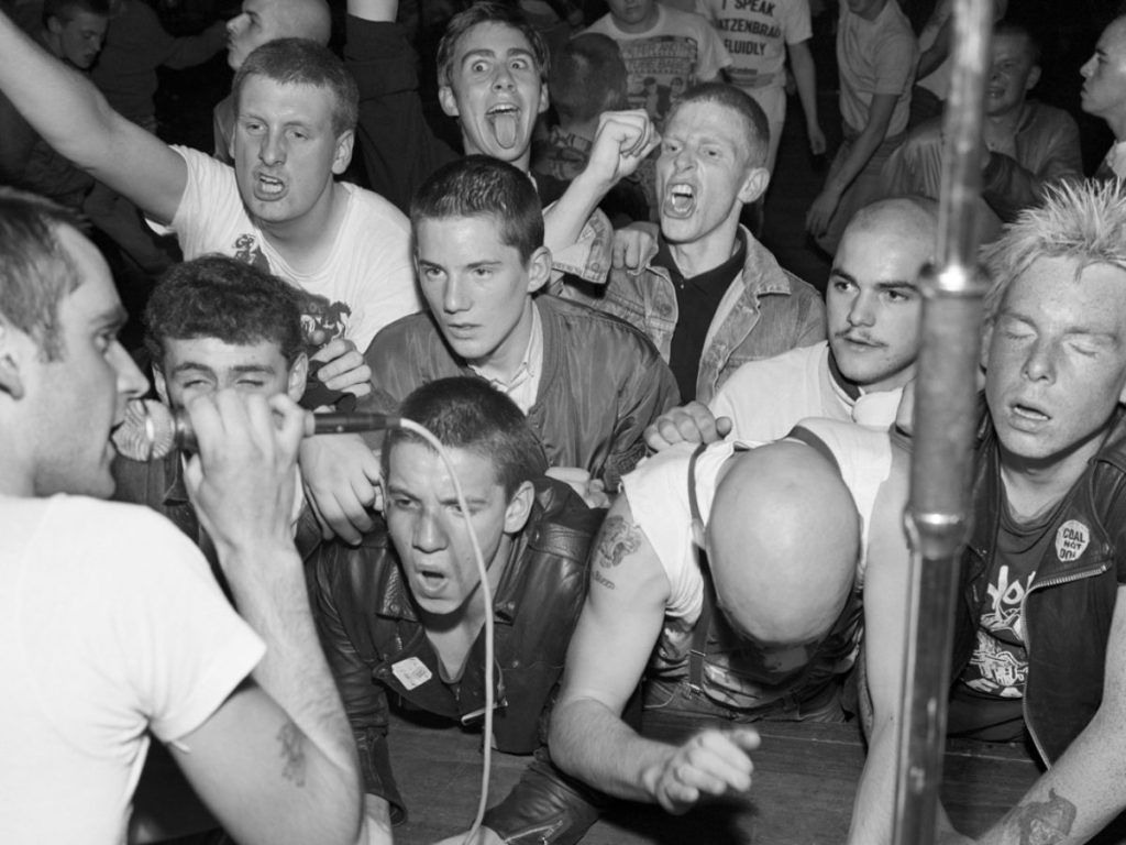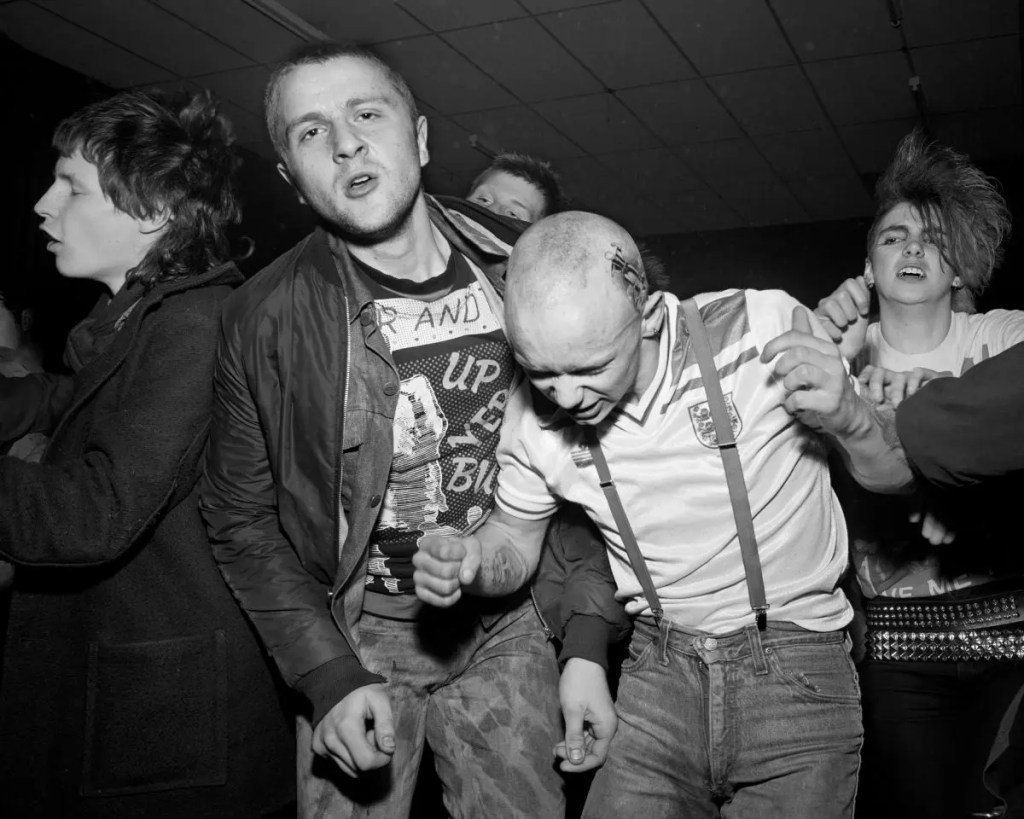 The Station itself was a derelict police social club given an anarcho-punk makeover using black paint paid for by a local council grant, with a roster of mainstay acts such as Hellbastard and Eat Shit and a sign forbidding the use of glue or glass bottles for anything other than their manufactured purpose (not that this deterred either glue-sniffing or violence, by all accounts). A Subhumans gig was too tempting for the local fash to not lay siege to, though one of Killip’s images shows a ‘Bulldog Breed’ tattooed skin side by side with a ‘Coal Not Dole’ badged anarcho-punk, surrounded by other skins. Indeed, any local mention of Station Skins at the time would more likely be associated with the bus station-dwelling Sunderland skinhead gang known by this name (their allied Oi band Zone 57, which included the late Dickie Hammond on guitar, was also named after a quadrant of the region’s bus fare zone map). Gig-goers of Sunderland’s own council-friendly DIY punk venue The Bunker were laid siege to by the Station Skins on several occasions, according to its musicians’ collective organisers more recently, though one of Killip’s standout images of the era is a 4-Skins shirt-wearing skin at an Angelic Upstarts miners’ benefit gig in the town’s Barbary Coast nitespot.