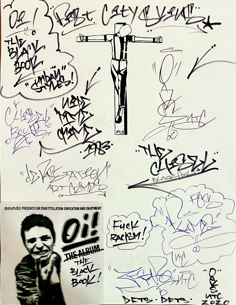 That’s a good question. I think for me, there was a working class, DIY, entrepreneurial-move fast and break things aspect to both cultures. I came to skinhead hand in hand with punk, but also learned about its pre-punk, hard mod and rudeboy culture-clash origins right off the bat. As an American skinhead I always identified skinhead more with work ethic than working class. Maybe I’m too American or too “old school” for today’s thoughts on this, but I was always apolitical but simultaneously patriotic, and a big part of that for my family growing up was the idea of connecting hard, honest work to success. Skinhead was the clean-cut alternative to punk. I always had a job (in an age when mohawks and hand tattoos were job-stoppers). There was a no-frills, DIY aspect that drew me to skinhead. It was simultaneously rebellious and respectful/ respectable. It asked no permission. Made no apologies. I think the same for graffiti. I was always more drawn to the parts of graffiti that outsiders considered vandalism, not permission pieces or multi-can productions. Mostly tags and throwies, simple styles.