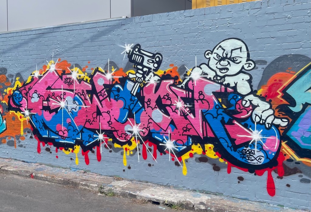 “So, I asked my mum to take me to see Breakin’ in the cinemas and she said, “No, I think it’ll be too mature for you’. I was 10 years old at the time. Then, when Beat Street came out, I asked her to let me see it, which she said yes to and took me, much to her horror when the swearing and train graffiti and death was all included within, haha. I was already trying to breakdance but the graffiti side of things I hadn’t been exposed to because we were living in Bundaberg, Australia. In the following days I asked my mum to get me some spray paint. Right across the road from my house was a drainage ditch we used to use as a playground and I went there in the middle of the day and tried to copy things I’d seen in Beat Street, like the ghetto blaster and the “do it!” guy doing a head spin.