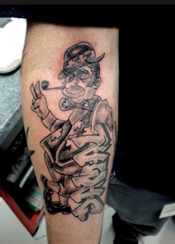 “When I first started going to shows in ‘86/’87 it blended in more because all the kids I met at CBGB’s matinees did graffiti. I guess they were more from the streets, you had people hanging out in the city (Manhattan) that came from our neighbourhoods in Queens that were part of that graffiti world, so it all just blended in. I started tattooing in like 1993. SEEN was a big influence being a tattoo artist and Graffiti writer. After doing basic graf stuff like characters as tattoos I then came up with my own style. I worked in Manhattan for seven years, then I got my own shop out in Long Island. Suburban kids really liked that urban graffiti style, and I still do a lot of graf tattoos”.