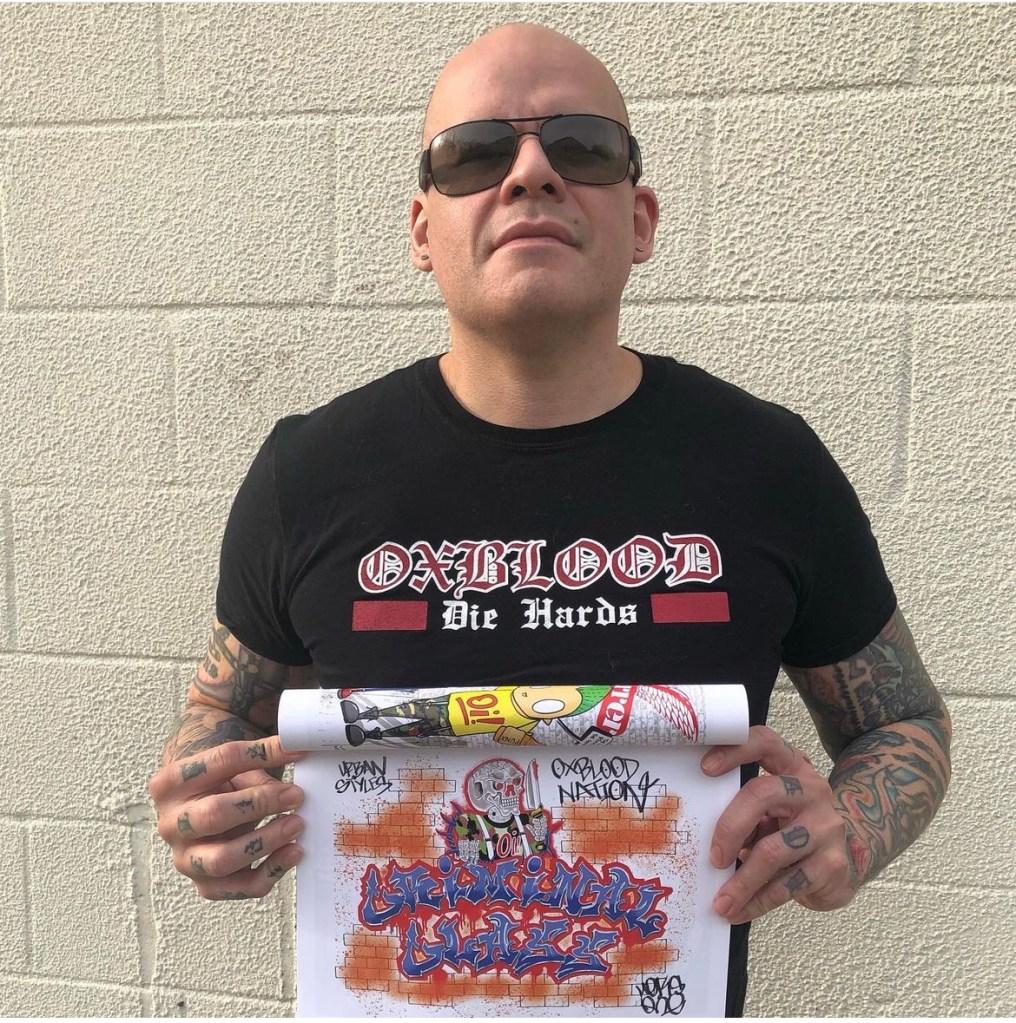 “When I came back and started hanging out again, the same people from the past weren’t around anymore, met new people, found out some of them played instruments, I started up a band with the original name being The Allies with Mac singing and before we found our drummer Harry, Raybeez from Warzone drummed for us a little bit. Harry came around and at first, we changed the name to Oxblut with the u having those two-dots umlaut thing, but then then we just did it straight up Oxblood and started using the boots logo. I didn’t really meet any writers in the Oi scene as opposed to the hardcore scene in the past. It was segregated: you got Oi skinheads, then the ska thing was big. The only skins that I knew from the past were into graffiti, there were never any that I met in the Oi scene. For Oxblood I did basic record cover art, but the rest of the band didn’t want graffiti art – by then, all that stuff was just one thing for a different scene. I just started getting into tattooing and did more graffiti-styled tattoos”.