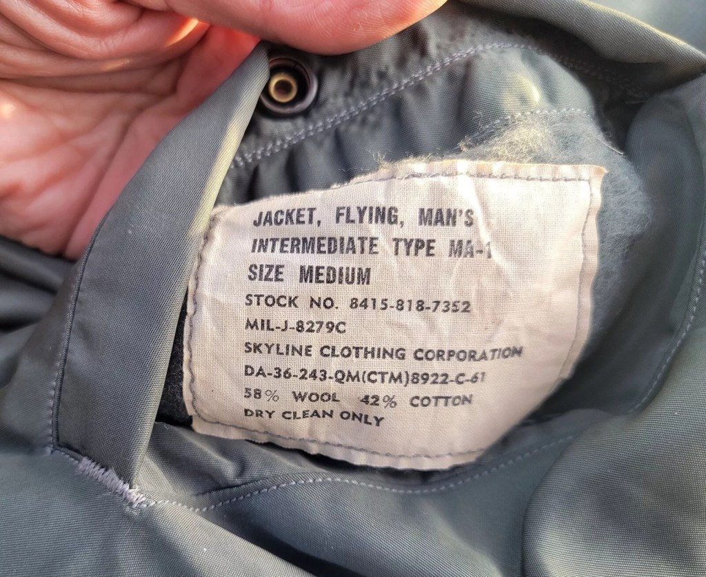 The history of the MA-1 begins in the 1950s, when the earliest examples were manufactured under the original MIL-J-8279 specification, officially adopted for service on 27 March 1953. They were essentially a version of the World War II B-15 flight jacket, with the mouton collar replaced by a knitted wool one – for fire safety reasons and for comfort when wearing a helmet. The earliest models came in airforce blue, inside and out, designed to match the USAF uniforms of the time.