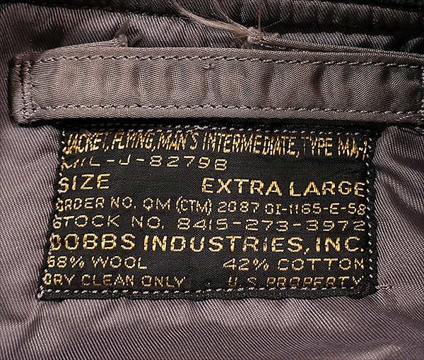 | MIL-J-8279 B (early) | 1958–59 | Gold-on-black embroidered label; zigzag stitching inside; oxygen mask nylon webbing, Crown/Conmar black zippers |