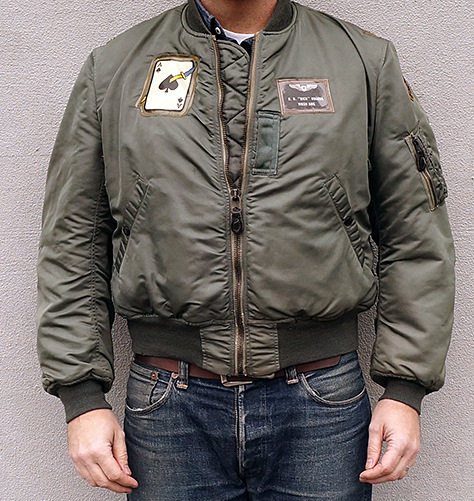 I once owned an early 1960s Skyline MA-1 myself. The fit was incredible: not a soft, formless balloon, but a roomy yet structured, square-like shape. The wool interlining made it cosy and warm in the winter, and the jacket was so sturdy it could almost stand up on its own! At some point, I foolishly sold it on because I decided the cuffs and waistband were too frayed, and the general condition had reached a point where it started to look like something you’d wear to a crust punk gig. Big mistake! Had I invested a hundred quid or so to have it re-cuffed and dry cleaned, I would still own what I believe was the best flight jacket ever made. Here’s a commemorative picture of my dearly missed Skyline: