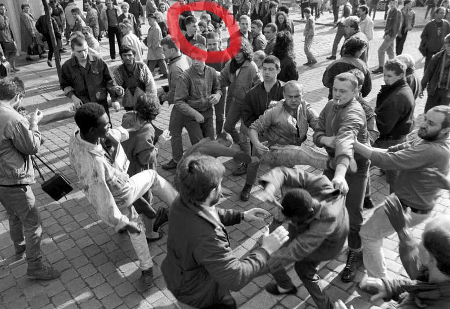 He took that guy’s banner. So yeah, he basically started it. Later the papers said that we had “come to beat people up”, which is why this was a practical rather than ideological issue. They also said there had been no police. But that wasn’t true – the cops were there standing by, and there were cop cars too. When the fight broke out, a cop car drove into the crowd and just tried to disperse it as it wasn’t quite clear who was who. Some whites joined in on the opposing side, and it turned into a general punch-up. The cops didn’t really know what was going on, and they couldn’t just come in and start hitting everyone. The papers complained that the cops had looked the other way. But what were they supposed to do – beat everyone up? Plus, the police were oversensitive at the time – better not hit anyone, lest you hit someone unnecessarily [the country was transitioning to capitalism in that year – MC).