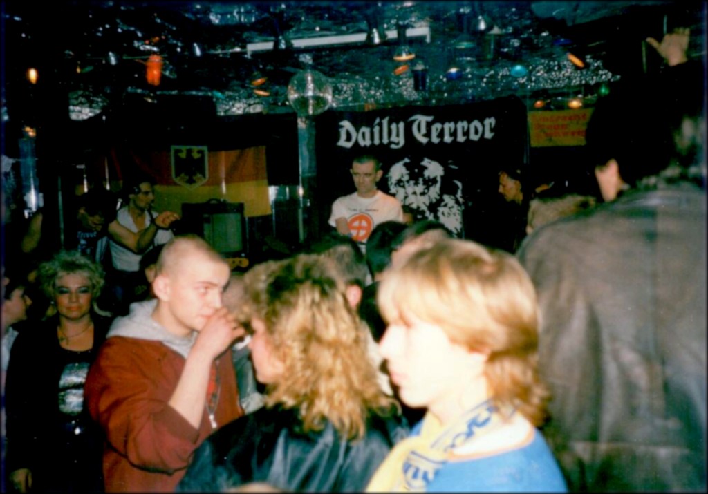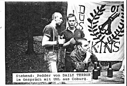 The Schöppenstedt extravaganza – 31 songs in over three hours without any support acts – was attended by a mixed crowd and reviewed in the first issue of Skintonic, an “anti-political” (but clearly left-leaning) skinzine from Berlin. Ugly, the reviewer, noted Pedder’s drunkenness and “skirmishes galore” among punters – including a fight between two skinhead girls that left one of them lying in a pool of blood. However, he had a good musical impression of Daily Terror and reported that Pedder, man of the people, met and greeted every group of punters individually before the gig.