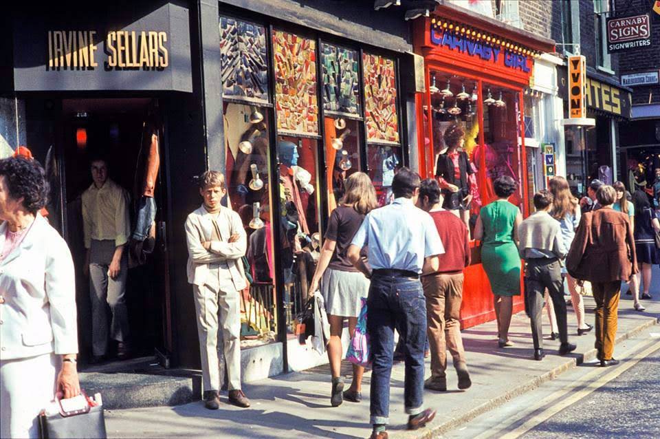 More independent boutiques sprang up – Gear at 35 Carnaby Street, Lord John at 43, and Lady Jane at 29. Within a few years, Carnaby Street became the epicentre of youth fashion and the ultimate symbol of ‘Swinging London’. Bands including the Small Faces, The Who and the Rolling Stones would drop by to grab freebies, socialise, and occasionally remind themselves they were meant to be recording music. The original mods had moved on, leaving behind what would later be called ‘peacock mods’ – extravagant dressers who effortlessly slipped into the psychedelic age.