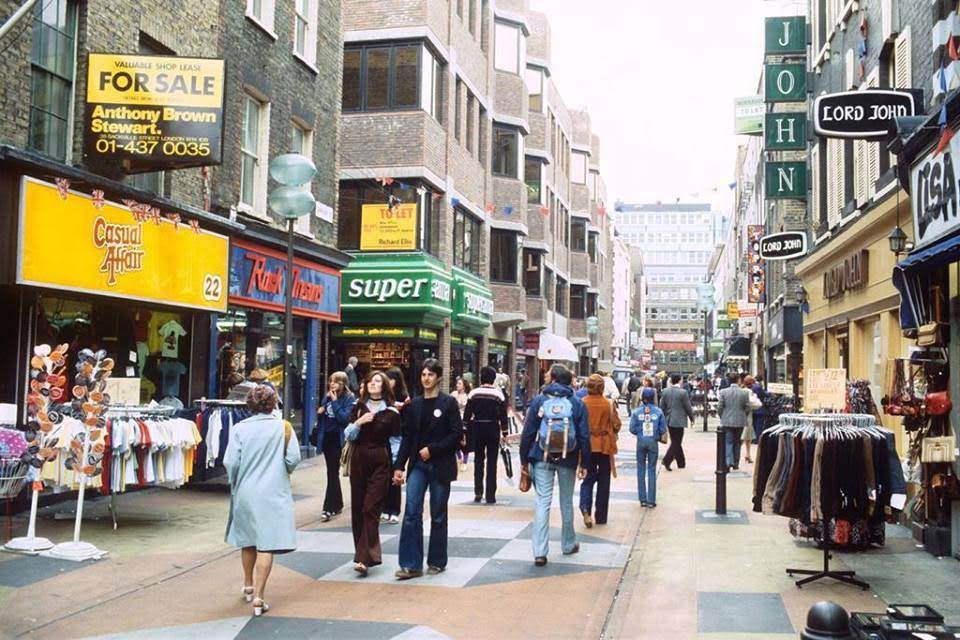 When the street was fully pedestrianised in 1973, the boutique fashion scene had already largely shifted to the Kings Road in West London – and by the late ‘70s, little of the Caraby Street’s former swing and glamour was left. As the photograph below shows, shops such as Lord John’s still stood, valiantly clinging on like ageing rock stars past their prime. But Carnaby Street had become a somewhat faded strip for tourists seeking cut-price souvenirs of a bygone era. Hippie tack was plentiful, while larger chain stores had moved in, often imitating the style of the once-independent boutiques.